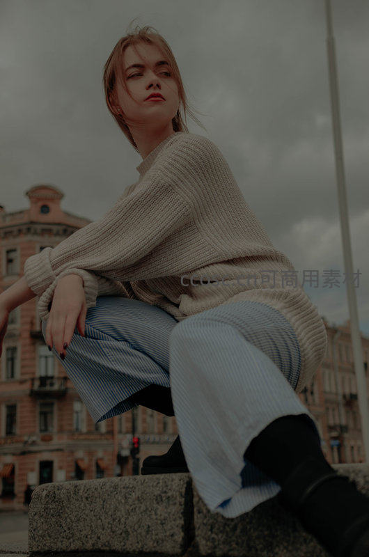 一位穿着宽松毛衣和条纹阔腿裤的女子坐在城市广场的石阶上,背景是欧式建筑,阴沉的天空衬托出她若有所思的神情和时尚造型。