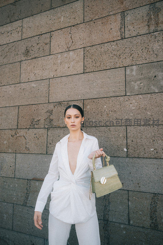 一位身着白色系带衬衫与长裤的女性,手持一款设计独特的绿色手袋,背景为质感石墙,整体风格简约而富有都市时尚感。