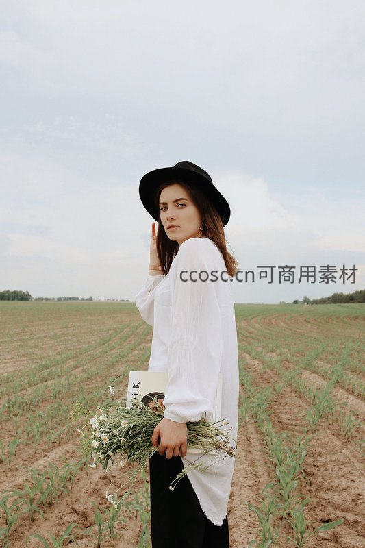 一位戴着黑色宽檐帽的女子站在开阔的农田中,手中捧着一束雏菊和一本书,背景是整齐的作物行,散发田园文艺气息。