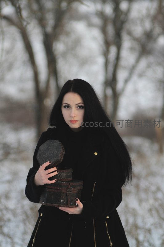 一位身着黑色大衣的长发女子站在白雪覆盖的林间,双手捧着一个精致的古旧礼盒,神情凝重,营造出一种神秘而静谧的冬日氛围。