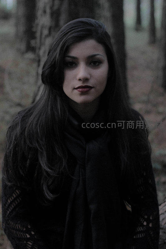 长发女子身着黑色镂空上衣与围巾,伫立于幽暗树林中,目光直视镜头,营造出一种神秘而宁静的氛围,凸显其优雅气质。
