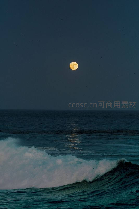 深蓝夜海之上,明月照亮翻涌巨浪
