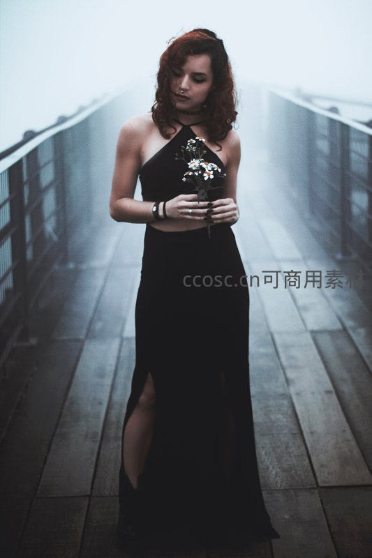 在浓雾笼罩的木桥上,一位红发女子身着黑色高开衩长裙,手捧一束小白花,低头凝视,营造出静谧、忧郁且充满诗意的视觉氛围。