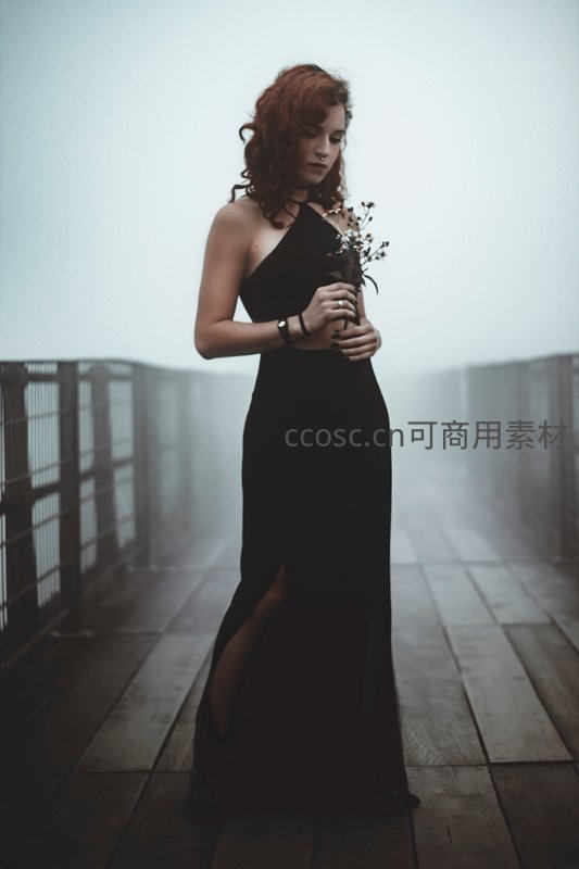 浓雾弥漫的木桥上,一位红发女子身着优雅的黑色长裙,手捧一束小白花,低头沉思,朦胧的背景衬托出她孤独而高贵的气质,画面充满电影感与诗意。