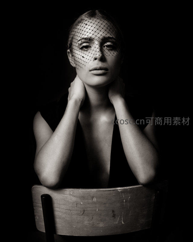 在纯黑背景下,一位女子戴着精致的黑纱面罩,双手轻抚颈部,坐在一把旧木椅上,强烈的明暗对比突出了她冷艳而神秘的神情,极具艺术表现力。