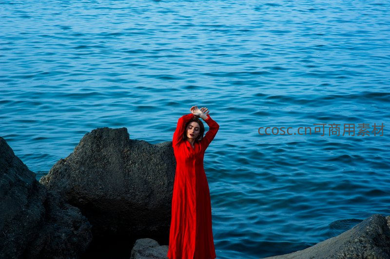 一位身着鲜艳红裙的女子静立在深蓝色大海旁的黑色礁石上,双手轻抚头顶,姿态优雅,与宁静的海面形成强烈视觉对比。