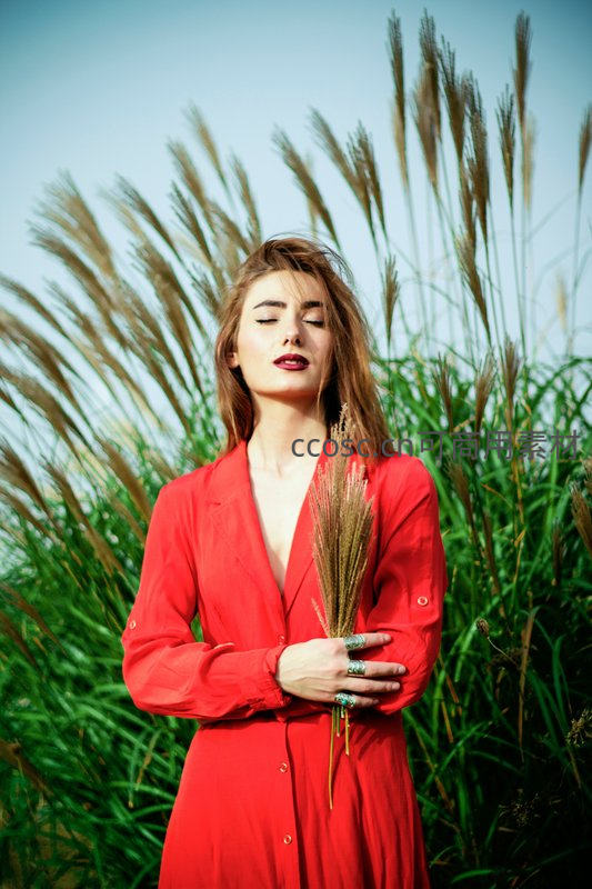 一位穿着红色连衣裙的女子站在茂密的芦苇丛中,闭目享受微风,手中轻握一束芦苇,神情安详,背景是清新的蓝天和绿植。