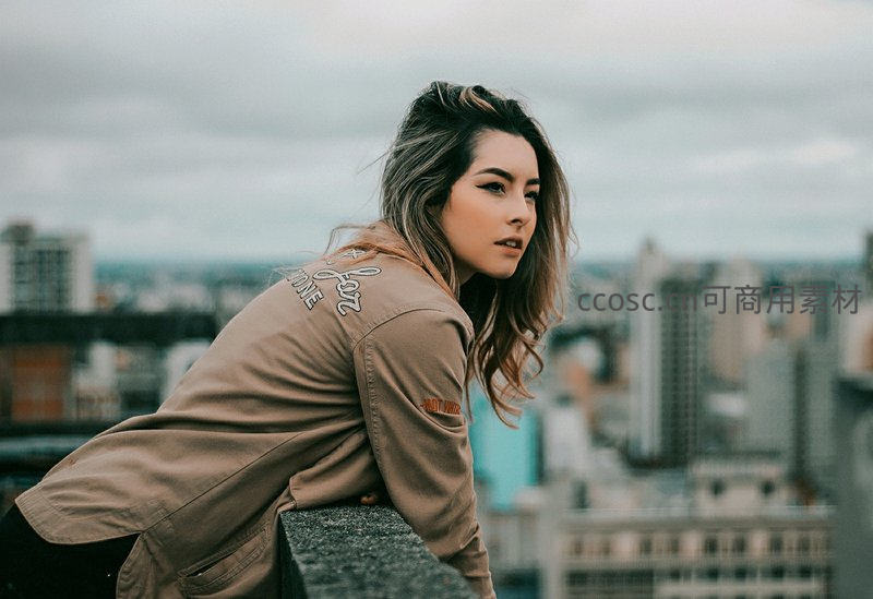 一位长发女子身着卡其色夹克,倚靠在高楼边缘,凝视远方的城市景观,展现出都市时尚与沉思氛围。