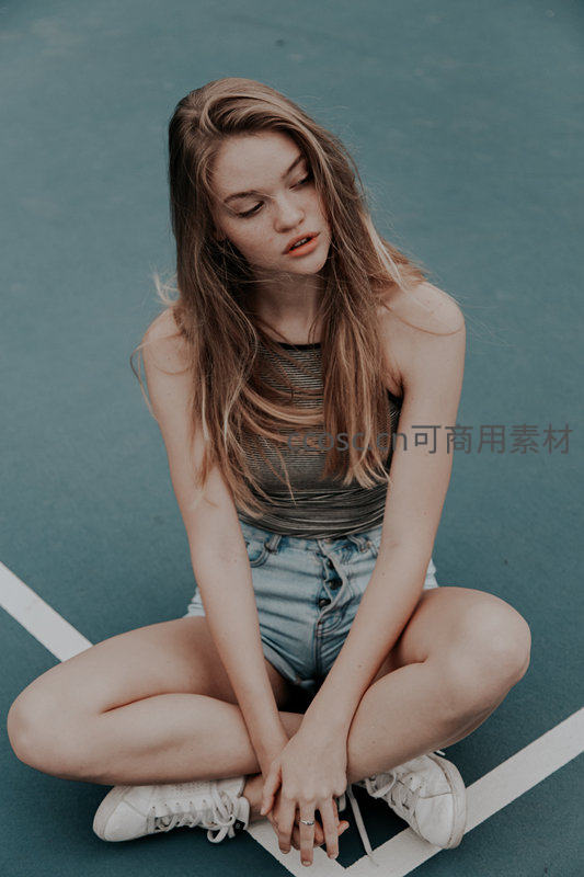 年轻女孩盘腿坐在蓝绿色球场上,身穿条纹背心和牛仔短裤,低头若有所思,传递出青春与宁静的气息。
