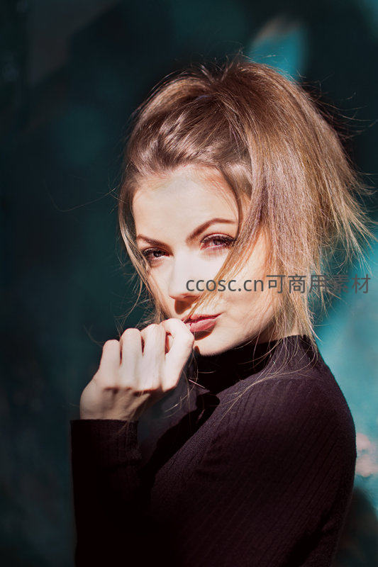 女子身穿黑色高领毛衣,在冷色调背景和戏剧性光线下,她侧脸凝视镜头,一手轻触下巴,散发出神秘、沉静且富有表现力的时尚氛围。