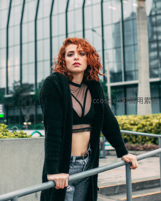 一位红发女孩身穿黑色毛绒外套和网纱内搭,站在现代化玻璃幕墙建筑前的金属栏杆旁,眼神坚定,展现出都市青年的独立与时尚态度。