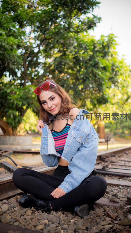 一位时尚女孩盘腿坐在废弃的铁轨上,头戴红色墨镜,身穿牛仔外套和条纹背心,背景是茂密的绿树,充满自由与冒险的气息。
