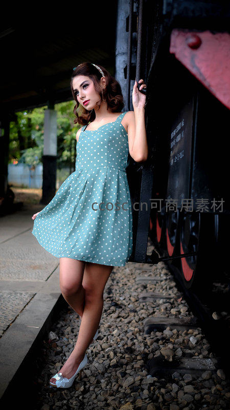波点裙女孩在旧火车旁摆拍