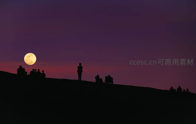 在紫红色的黄昏天际线下,一群人的剪影静静伫立在山坡上,共同凝望一轮明亮的满月,画面充满诗意与温馨。