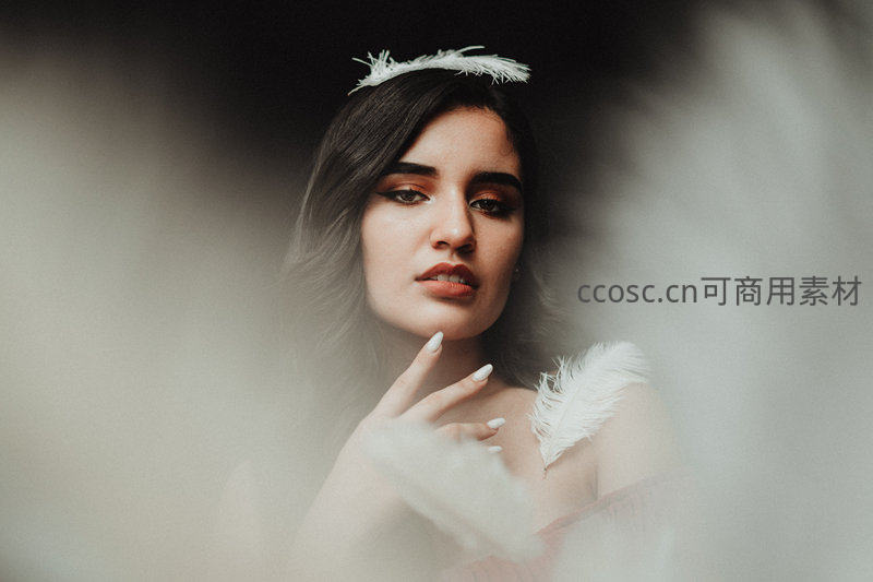 通过朦胧前景拍摄的女性特写,她佩戴羽毛头饰与肩饰,妆容精致,眼神深邃,营造出如梦似幻的天使般唯美氛围。