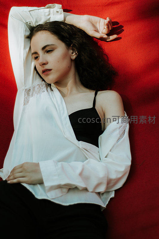 女性躺在鲜红色背景布上,身穿白色蕾丝边衬衫与黑色吊带,姿态慵懒放松,光影对比强烈,充满艺术表现力与情绪张力。
