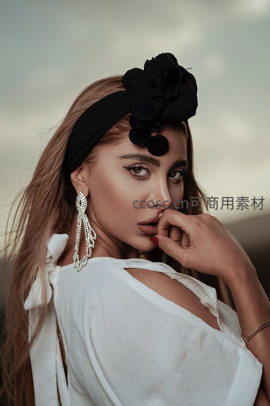 女子佩戴黑色花朵头饰与流苏钻饰耳环,妆容精致,眼神迷人,整体造型高贵典雅,充满时尚感与艺术气息。