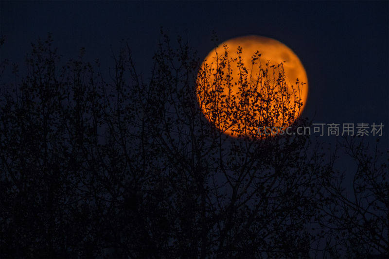 一轮巨大的橙色满月被前景中稀疏的树枝剪影部分遮挡,明暗对比强烈,创造出一种幽深、静谧且富有层次感的夜间美景。