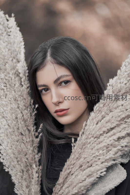 女子置身于柔软芦苇丛中,深色长发垂落肩头,眼神温柔而沉静,背景朦胧,营造出诗意浪漫的自然人像氛围。