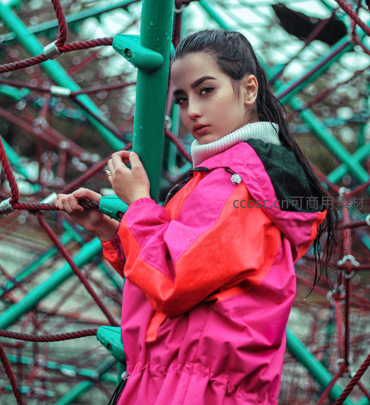 少女身着亮粉色拼接冲锋衣,在绿色绳网攀爬架上回头凝望,湿漉漉的长发与鲜艳色彩形成对比,洋溢着青春动感与探索精神。