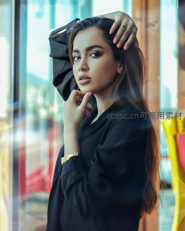 一位穿着黑色上衣的女子倚靠在窗边,一手托腮,一手轻抚头发,窗外城市光影朦胧,尽显都市女性的时尚与沉静。