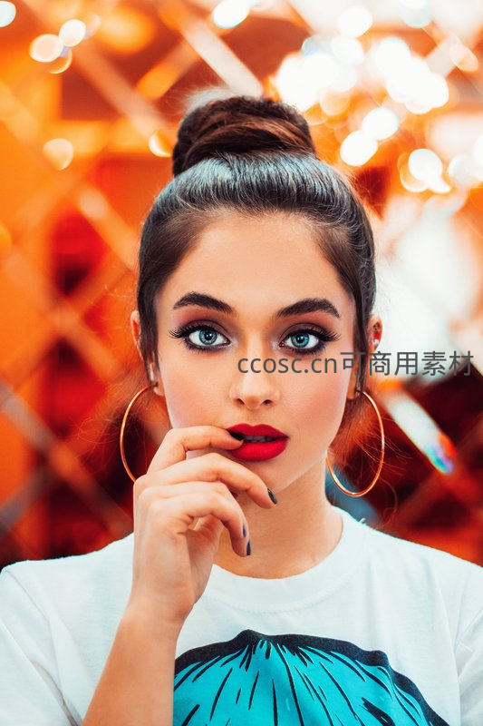 一位年轻女性化着精致妆容,涂着鲜艳的红色口红,眼神专注地凝视镜头,背景是温暖的橙色光斑,营造出时尚而迷人的氛围。