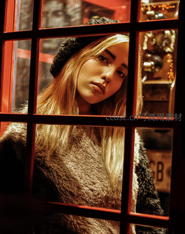 一位金发女子戴着黑色针织帽,身穿毛绒外套,透过红色窗格凝视镜头,背景灯光朦胧,营造出温暖而神秘的冬日氛围。