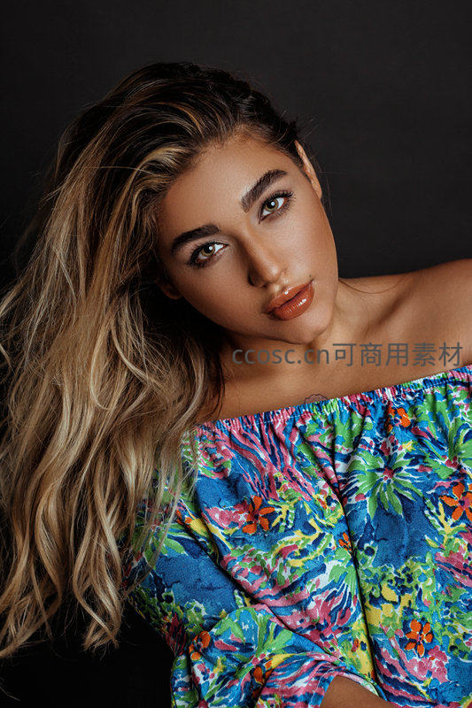 一位金发女子身着色彩斑斓的热带印花露肩上衣,侧脸凝视镜头,精致妆容与深邃眼神在纯黑背景下格外突出,充满夏日风情。