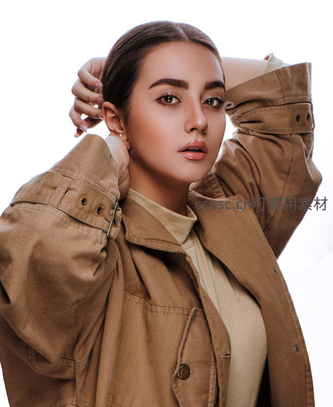 模特身穿米色工装风外套,内搭同色系打底,双手轻抚发丝,背景简洁突出人物,展现现代都市女性的清新与自信。