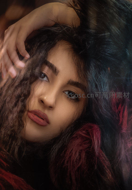 特写镜头捕捉女子在红黑毛绒背景下的侧脸,她的眼神深邃迷人,手轻抚发丝,整体色调浓郁,充满艺术感和情绪张力。