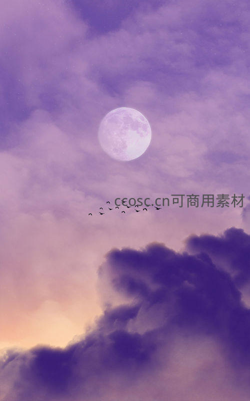 在梦幻般的紫色晚霞中,一轮皎洁的满月高挂,一群飞鸟掠过云层,构成一幅充满诗意与浪漫的天空画卷。