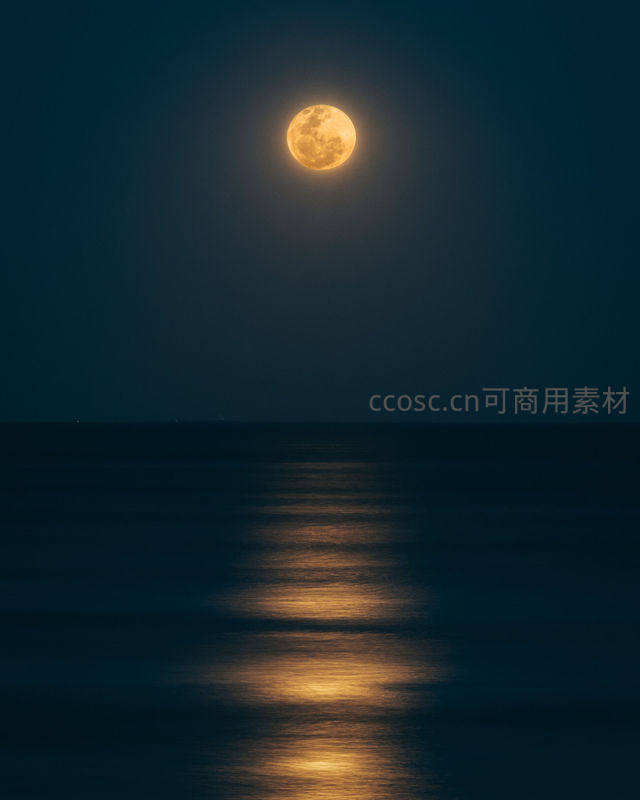 一轮金黄的满月高悬于深邃夜空,其光辉在平静海面上拉出一道明亮的光路,营造出宁静而神秘的氛围。