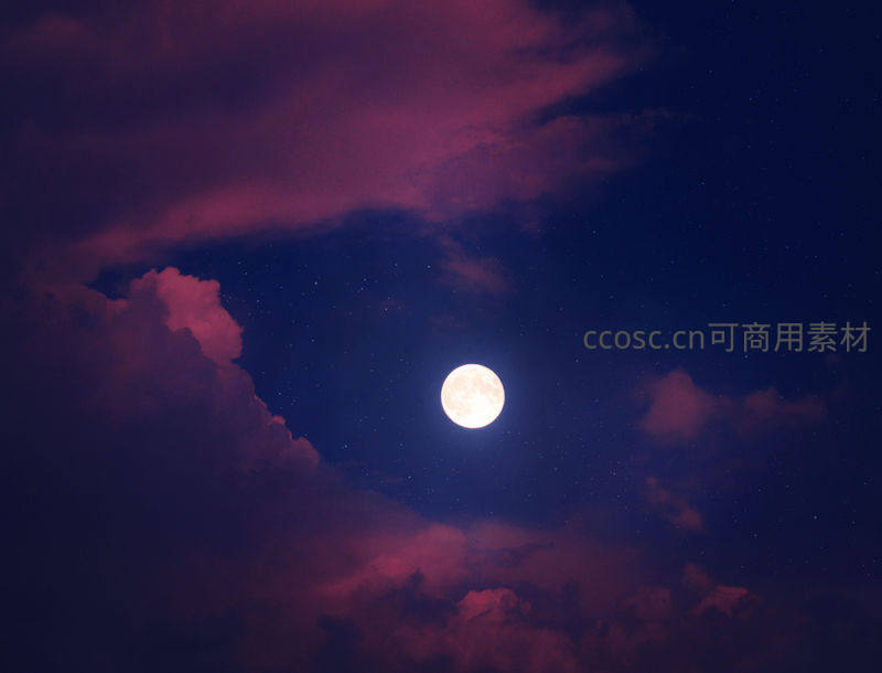 在缀满星辰的深蓝夜幕下,一轮清亮的满月被紫红色的云霞温柔环抱,散发着静谧而浪漫的光辉。