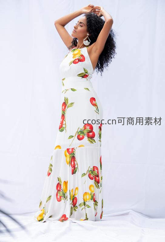 水果印花长裙的优雅姿态