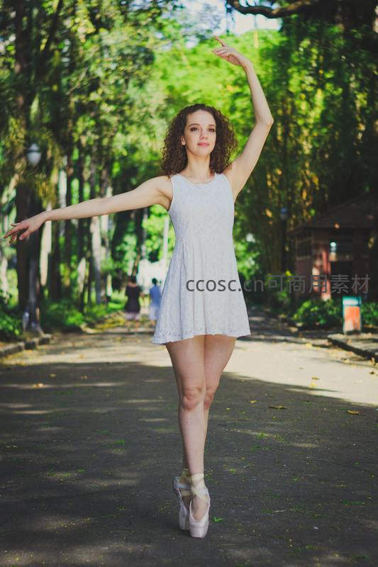 一位身着白色蕾丝连衣裙的年轻女子在绿树成荫的林荫道上踮起脚尖,摆出优雅的芭蕾舞姿,阳光透过树叶洒下斑驳光影。