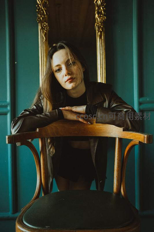 复古皮衣女子倚靠木椅凝视镜头