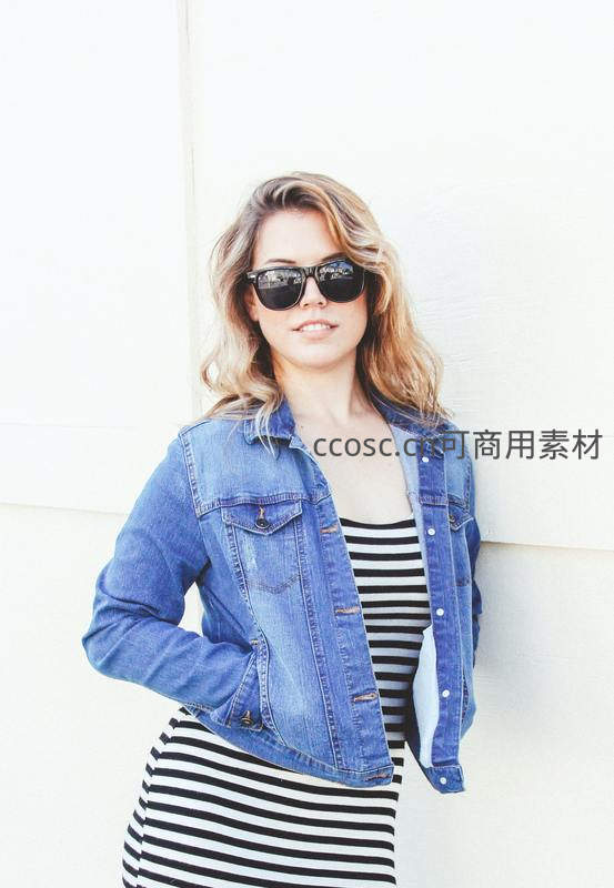 金发女子身穿经典条纹裙外搭蓝色牛仔外套,佩戴墨镜,在白色墙前微笑望向镜头,展现出轻松自在、阳光活力的日常风格。