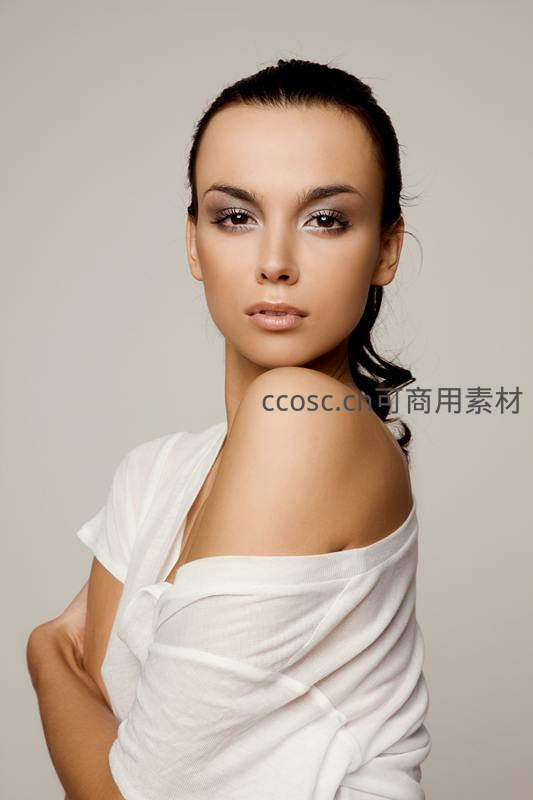黑发女子将白色T恤随意披于肩头,精致眼妆与自然唇色相得益彰,侧脸回眸凝视镜头,尽显清新脱俗的优雅气质。