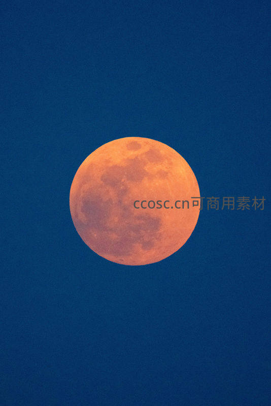 一轮橙红色的满月在深蓝色的夜空中显得格外明亮,月面纹理清晰可见,营造出宁静而神秘的氛围。