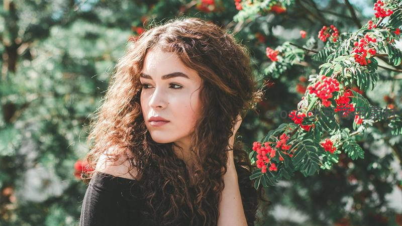 一位拥有浓密卷发的年轻女子,在阳光明媚的户外,背景是挂满鲜红果实的绿叶植物,画面充满生机与宁静的自然气息。