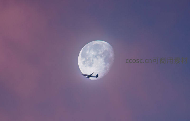 一架客机从巨大明亮的满月前飞过,形成精彩的剪影,紫色云霞为这幅天空奇景增添了梦幻色彩。