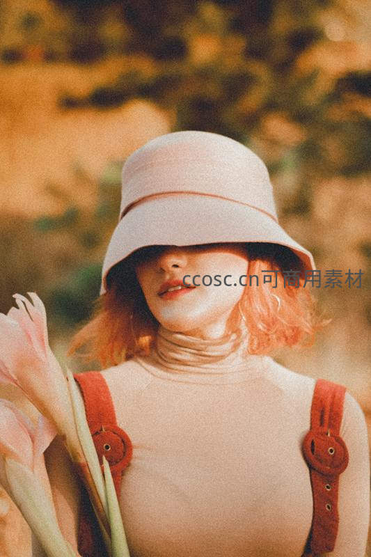 戴着浅色宽檐帽的少女手捧粉色花朵,阳光洒落,暖色调映衬其恬静笑容,营造出温馨浪漫的秋日田园氛围。