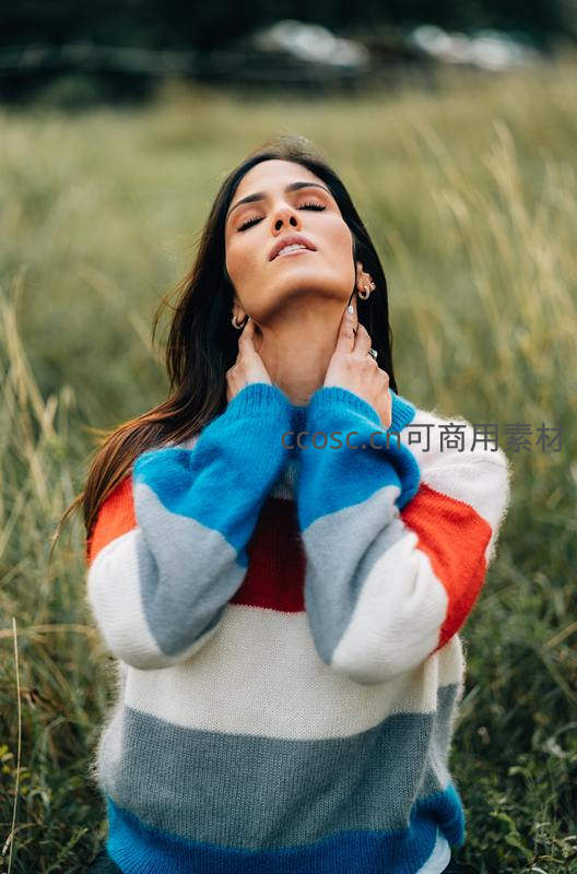 女子身穿蓝灰白红条纹毛衣,闭目享受田野微风,双手轻抚颈部,沉浸在大自然的宁静中,传递出平和与自我疗愈的情感。