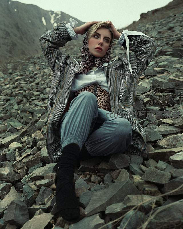 一位身着格纹外套、豹纹头巾的女子,坐在布满碎石的山野中,双手轻抚头顶,目光直视镜头,背景是苍茫的山峦,整体风格兼具野性与时尚感。