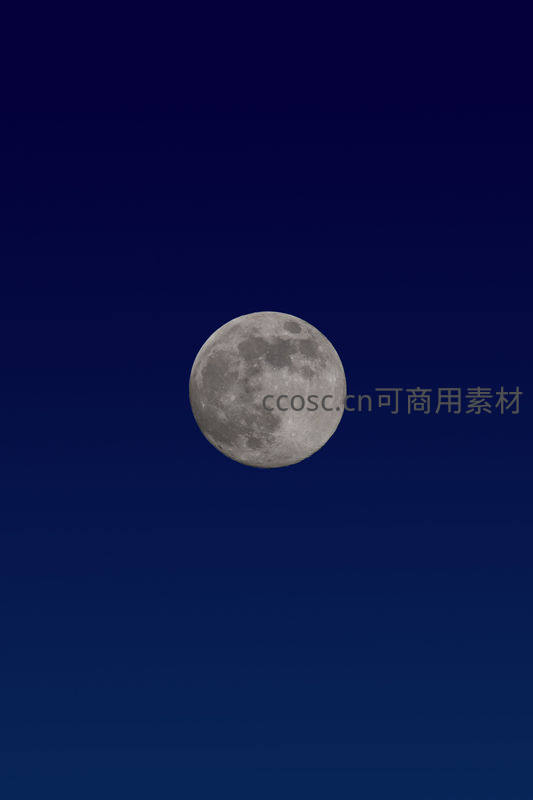 一轮银灰色的满月在纯净的深蓝色夜空中清晰可见,月球表面的环形山和月海纹理细节分明,令人赞叹。