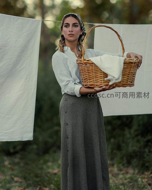 林间晾衣女子手提藤篮