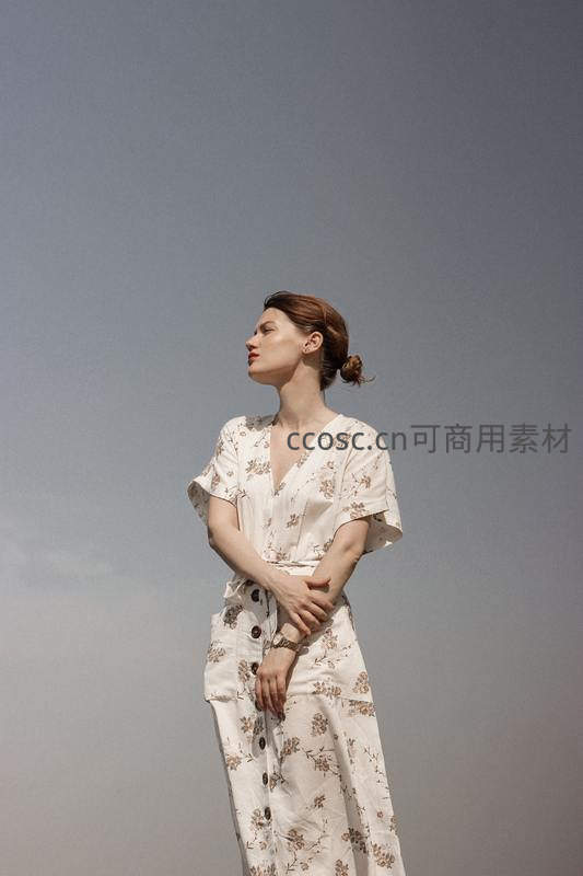 一位红发女子身穿白色碎花连衣裙,在纯净的灰蓝色天空下静立,她微微仰头闭目,双手交叠于腹前,神情恬淡,仿佛在享受片刻的宁静与自由。