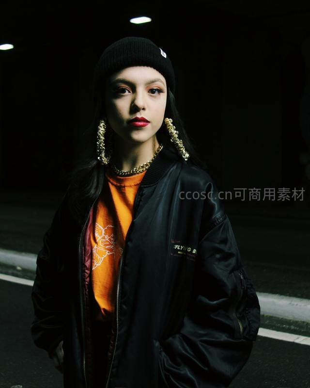 女孩置身于昏暗的地下通道中,头戴黑色针织帽,身穿黑色夹克内搭橙色印花T恤,佩戴夸张金色耳环和项链,散发强烈的街头潮流与个性气场。