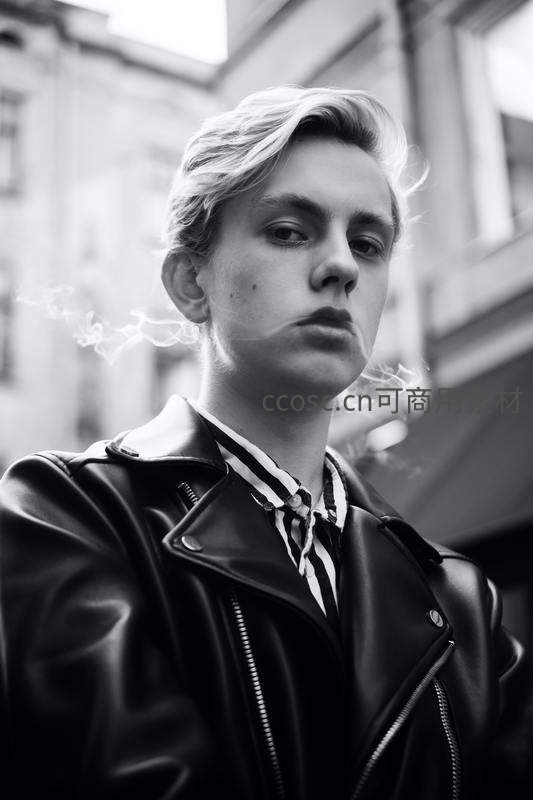 一位金发青年身着黑色皮夹克,在街头背景下凝视镜头,黑白影像强化了其冷峻气质与时尚感,烟雾缭绕增添神秘氛围。