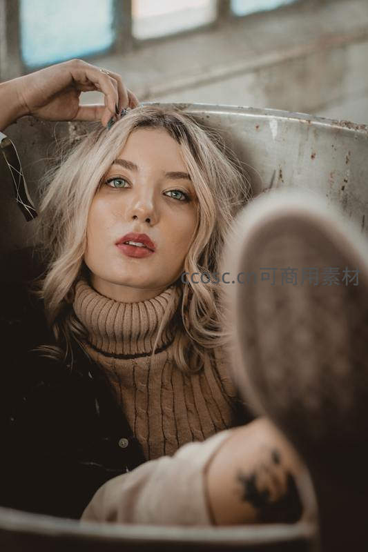 金发女子穿着高领毛衣,慵懒地躺在破旧浴缸中,眼神迷离,手臂纹身若隐若现,融合颓废美学与时尚感。